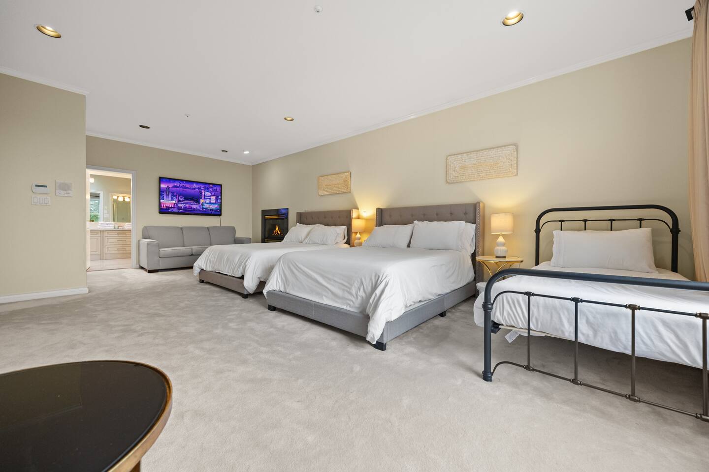 The Space 7 Bedrooms · 5.5 Bathrooms · 3 Levels Designed to accommodate larger groups comfortably without feeling crowded. Sleeping Overview: • Multiple queen beds across basement and main levels • Upper-level primary suite with additional sleeping space • Flexible layouts suitable for group stays • Cribs available Bathrooms include walk-in showers and soaking tubs. Ideal For • Corporate retreats • Team off-sites • Workcations • Multi-family gatherings • Extended group stays Amenities • Hot tub • Spacious living & dining areas • Fully equipped kitchen • Indoor fireplace • Dedicated workspace • Fast Wi-Fi • Washer & dryer • Gated parking (up to 5 vehicles)