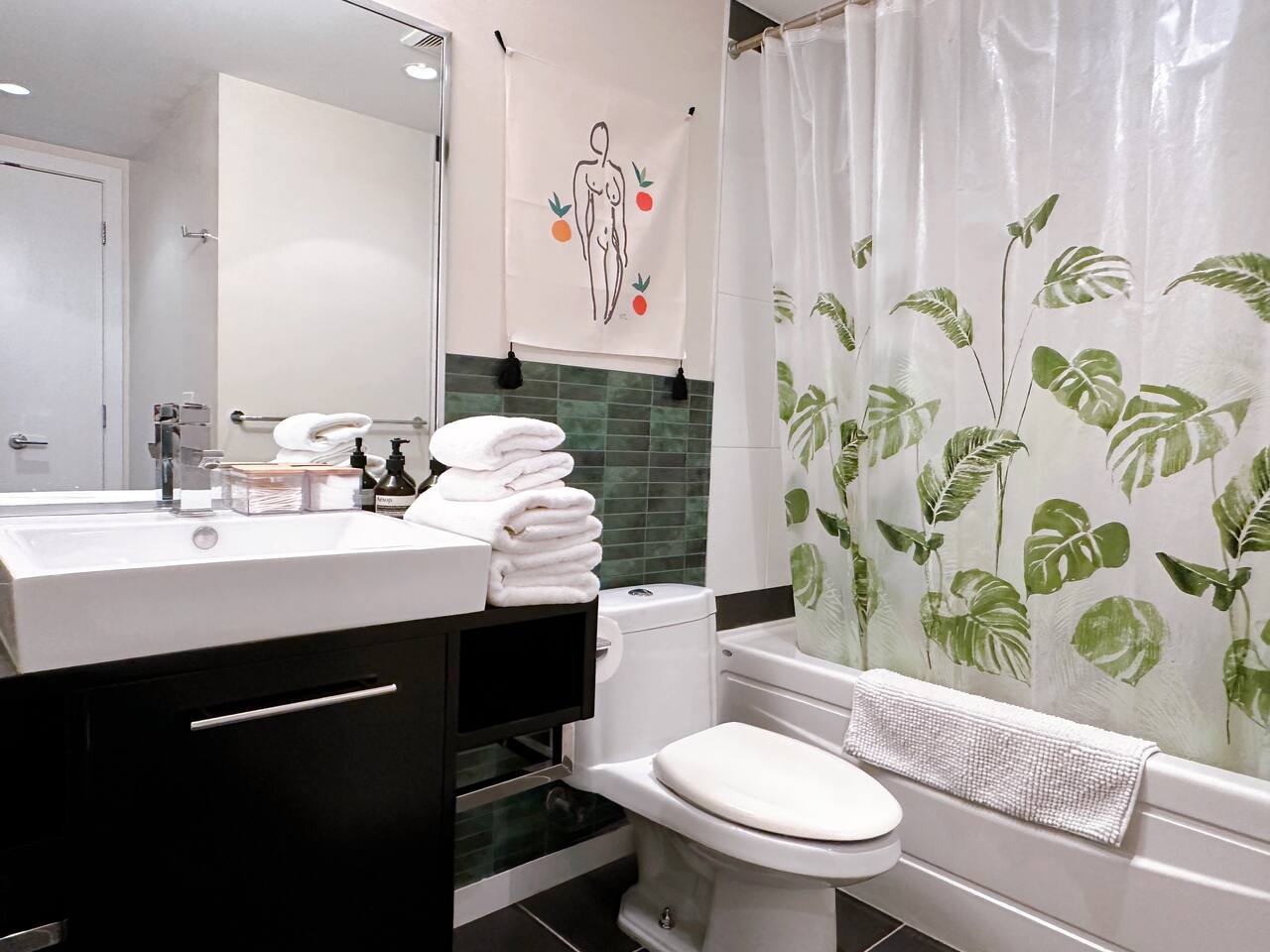 Cozy Bedrooms: ✔ Primary Bedroom: Queen-sized bed, private ensuite bathroom, work desk, and stunning mountain views. ✔ Den: A comfy single-sized bed, perfect for extra guests. ✔ Extra Sleeping Space: Convertible sofa bed in the living room for added flexibility. Fully Equipped Kitchen: ✔ Nespresso machine with complimentary capsules ✔ Full-size stove, oven, dishwasher, and microwave ✔ Sleek glass dining table ✔ Breakfast bar stools to start your day right Relax & Unwind: ✔ Smart TV with Netflix, Disney+, and Roku ✔ Fast 5G WIFI for work & streaming Spa-Like Bathrooms: ✔ Stocked with fresh towels, shampoo, conditioner, body wash, toothpaste, and cotton swabs