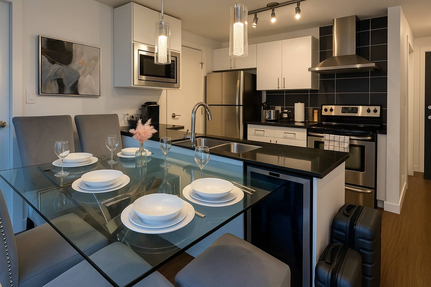 โจ Cozy Bedrooms: Bedroom 1: Queen-sized bed, private bathroom, desk & chair, plus a stunning mountain view โฐ. Bedroom 2: Queen-sized bed, desk & chair, closet, and an amazing city view ๐. Bedroom 3 (Den): Single-sized bed โ perfect for an extra guest! Extra Sleeping Spot: -The comfy sofa in the living room easily converts into a bed. ๐ฝ Kitchen & Dining Magic: โ๏ธ Fully equipped kitchen with everything you need! โ๏ธ Nespresso machine with complimentary coffee. โ๏ธ Dishwasher, microwave, full-size stove & oven. โ๏ธ Elegant glass dining table for your meals. โ๏ธ Cozy breakfast bar stools for quick bites. โ๏ธ Complimentary laundry service upon request. โ๏ธ Chill in the Living Room & Balcony: โ๏ธ Smart TV with Netflix, Disney+ & Roku. โ๏ธ Balcony seating โ perfect for morning coffee, sunsets, or a good book. โ๏ธ Super-fast Wifi for work & entertainment. ๐ Bathroom Bliss: โ๏ธ Stocked with essentials: towels, toilet paper, hand soap, shampoo, conditioner, body wash, toothpaste & cotton swabs.