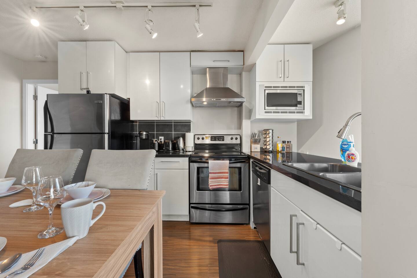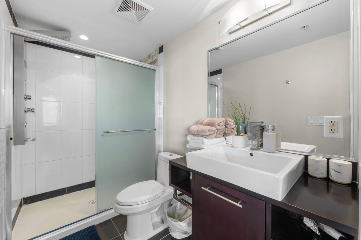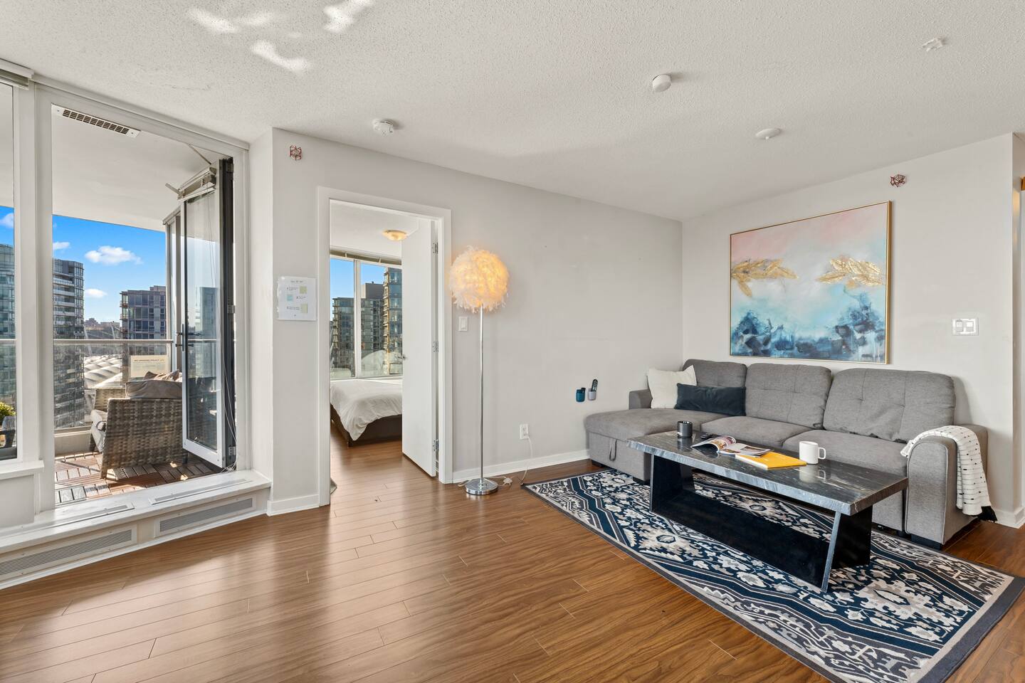Bedrooms: Primary: Queen bed, ensuite, desk, mountain view Second: Queen bed, desk, city view Den: Single bed for extra guests Extra: Sofa in living room converts into a bed Kitchen & Dining: Fully equipped: Nespresso (free pods), stove, oven, microwave, dishwasher Dining: Glass table + breakfast bar with stools Living & Balcony: Smart TV w/ Roku Private balcony for coffee or sunsets 🛜Fast 5G WiFi 🚻Bathrooms: 🧴Fresh towels & essentials (shampoo, conditioner, body wash, toothpaste)